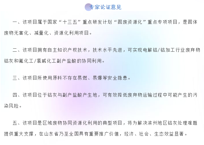 與會專家聽取了建設(shè)企業(yè)及技術(shù)團隊對技術(shù)總體情況的匯報。在充分質(zhì)詢、討論后,專家一致認(rèn)為,本項目技術(shù)路線合理、前期基礎(chǔ)扎實,可實現(xiàn)電解鋁/鋁加工鋁灰和副產(chǎn)鹽酸的協(xié)同利用,屬典型的資源循環(huán)利用項目。
